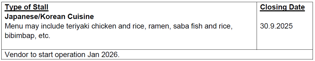Applicants are to present samples of their proposed food items (at applicant’s own expense) for food tasting session by the Canteen Selection Committee.